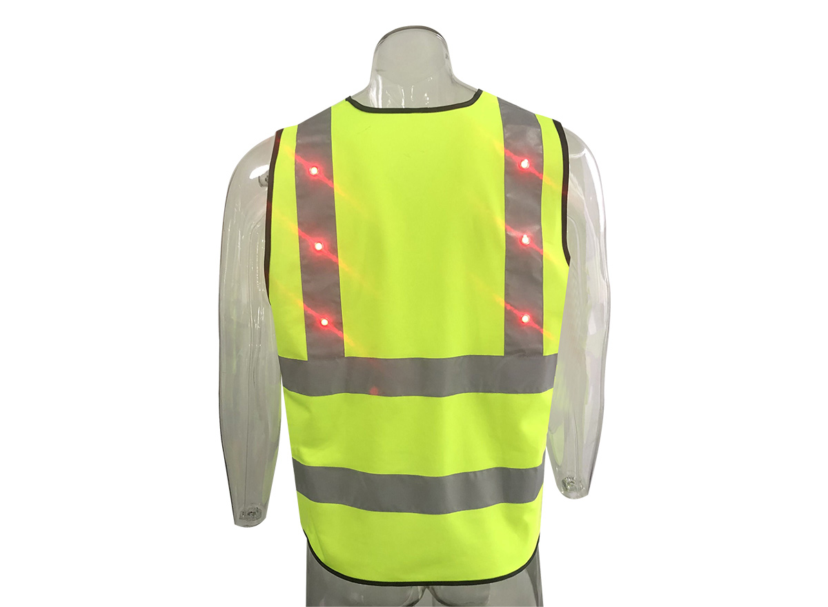 产品特点: 1、整件衣服配有8条反光条+12颗鸡眼灯、双重警示,警示范围可达800-1000米 2、独立控制器设计,可将控制器取下充电 3、产品只有0.26KG左右,轻便、透气 4、将控制器取下即可水洗,鸡眼灯防水