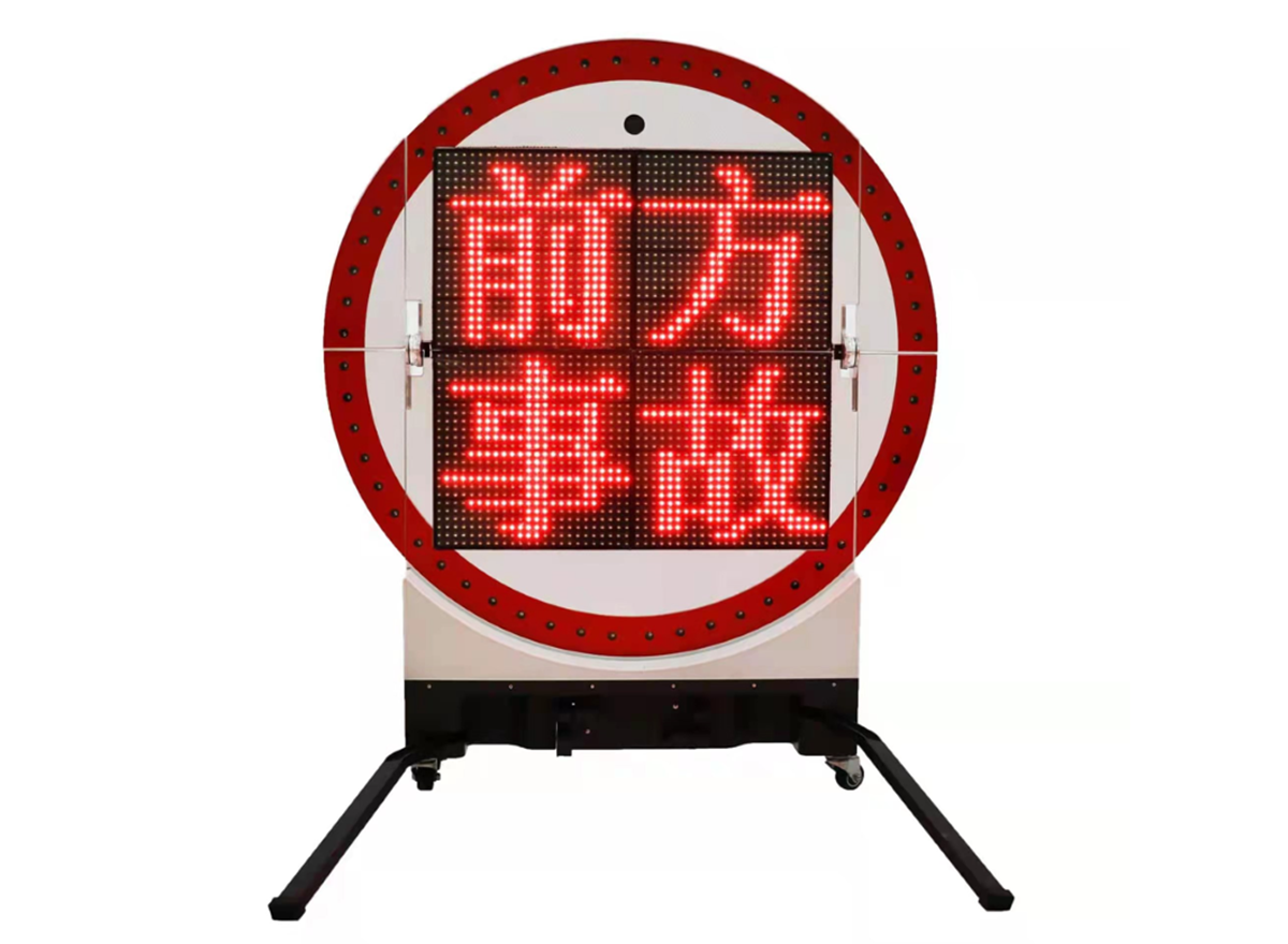 该产品不使用时,折叠起来如同一款行李箱,可放在车辆的后备箱备用,当需要使用时,从车辆中拿出来,沿地拖行至现场指定位置后打开即可使用,LED显示屏中可显示各种已设置的警示标志、提示图案、提醒文字等内容,可视距离达200m以上(可视角度150度),能提前告知及提醒行人、车辆前面出现特殊事件,注意行车安全,更有效地降低交通事故、二次事故的发生。