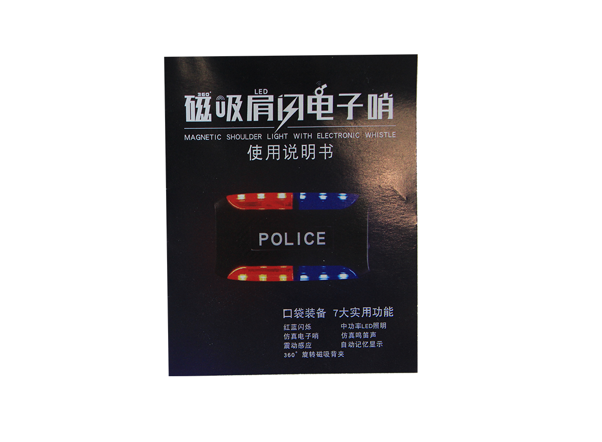1. 长按3秒开机,每按一次“发光”键,工作模式依次从:红蓝对角闪烁-双红双蓝闪烁-外侧单边闪烁-白光照明循环切换